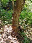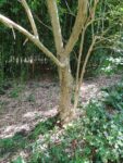 Der Stamm gabelt sich in ca. 1,5 m Höhe, die Krone ist zum Weg hin geneigt, einige Äste sind tot.