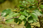 Blätter relativ klein, ca. 45 x 30 mm, fein gezähnt, mit bogiger Nervatur. Früchte kugelig, ca. 6 mm Durchmesser, im Juli grün, bei Reife schwarz, an dünnem Einzelstiel meist zu 5-10 zusammenstehend.