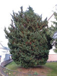 Einstämmig mit dichter, breit-aufrechter Krone und sehr feinen, dunkelgrünen Schuppenzweigen. Stammumfang nach Durchmesser (40 cm) berechnet (nicht zugänglich).