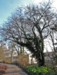 In 1,30 m Höhe dreistämmig, Aufteilung beginnt bereits am Stammfuß. Starker Efeubehang.