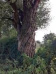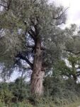 Silber-Weide mit massigem, geradem Stamm, umwuchert von Brennesseln und Brombeeren.